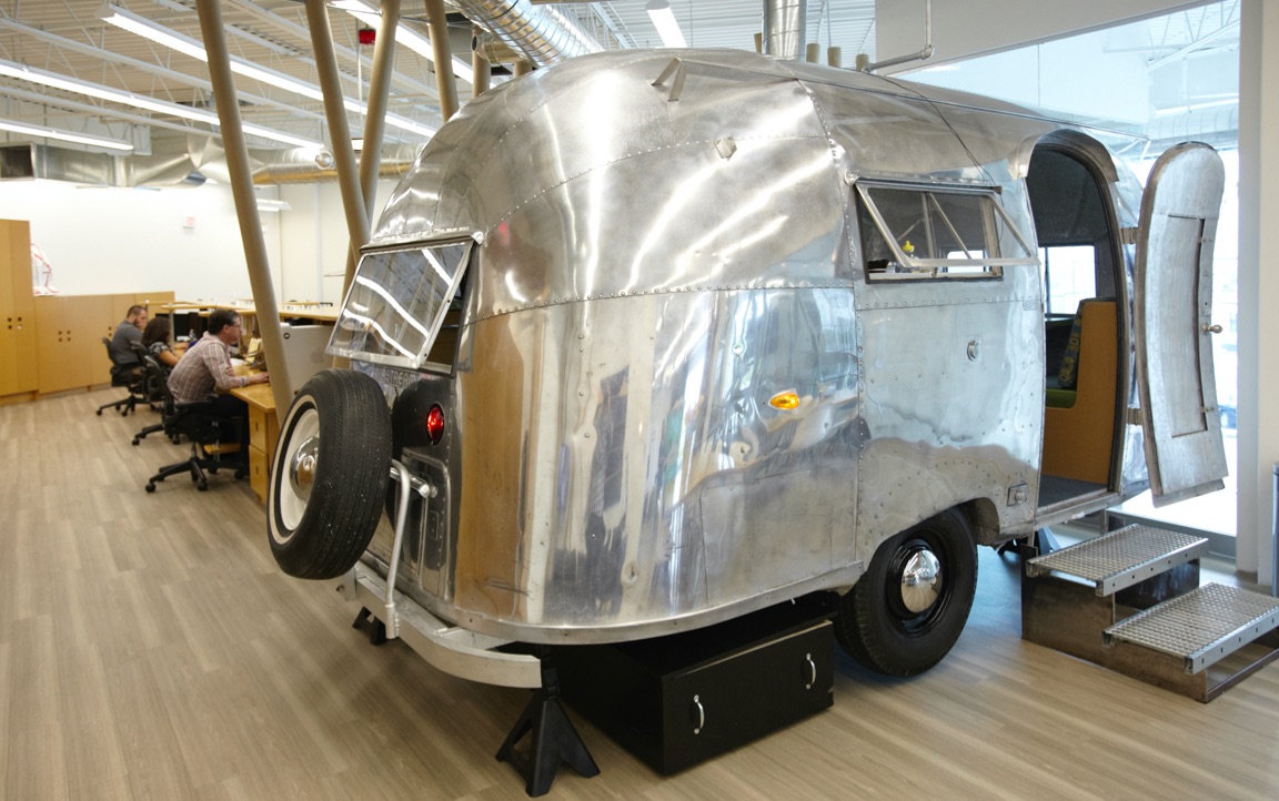 Working with an open concept desk environment, the offices are reminiscent of backlot Hollywood with 3 areas that require either visual or sound separation. The president's office, recording studio and the commissary are all housed in vintage Airstream trailers. Trailers, desks equipment can be moved to accommodate one on one interviews, music recording sessions to a 90 person NFL shoot.